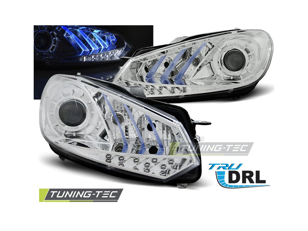 SVĚTLOMETY S PRAVÝMI DENNÍMI SVĚTLY, CHROMOVANÉ, MODRÉ, vhodné pro VW GOLF 6 10.08-12