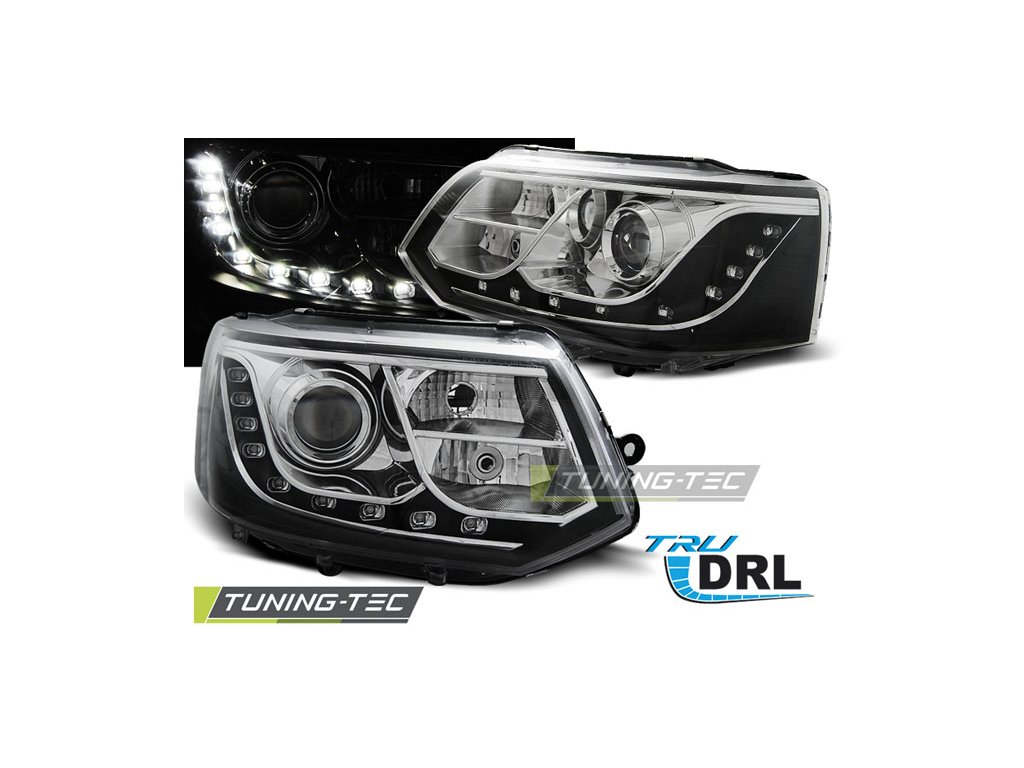 SVĚTLOMETY S PRAVÝMI DENNÍMI SVĚTLY, CHROMOVANÉ, vhodné pro VW T5 2010-2015
