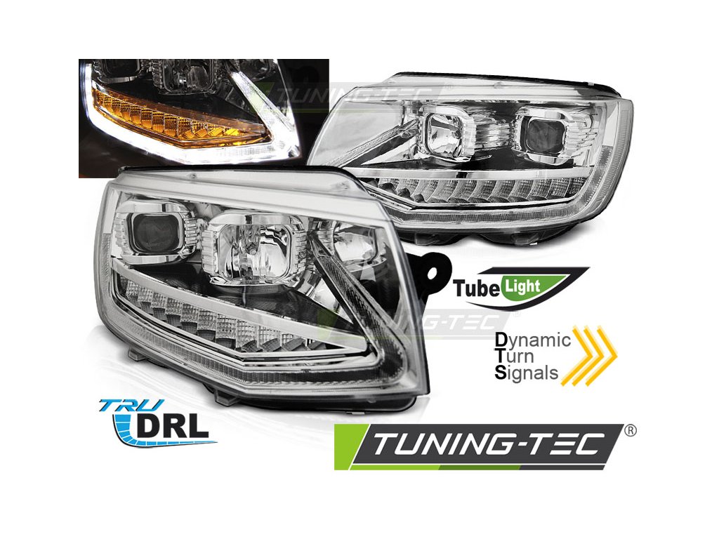 TRUBIČKOVÉ SVĚTLOMETY CHROMOVANÉ PRO DENNÍ SVĚTLA SEQ PRO VW T6 15-19